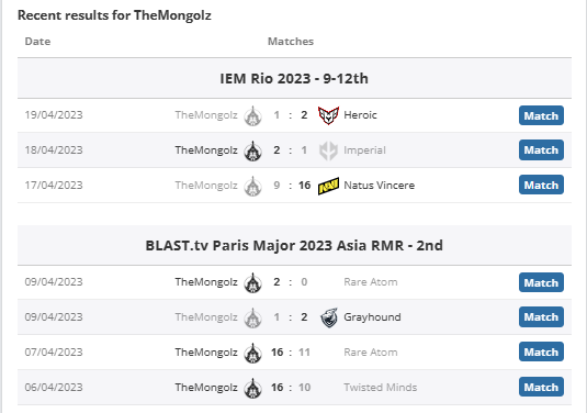 上半年一度在卡托发光发热后的蒙古队经历了一番波折,先是队内明星选手sk0r的离队让队伍的火力缺失了一部分,再是因为新队员hasteka的加入与东家IHC的纠纷,他们在RMR中以TMGZ的面貌出现。虽然队伍火力较之以前明显不足,但整体的战术思路仍能得到完整发挥。在RMR中以第二名进入Major,随后在IEM里约中以1-3的战绩淘汰,后因为签证问题放弃了ESL墨尔本站的直邀名额。总体来看,TMGZ在24支队伍中位于偏弱的位置,但每次国际大赛多多少少仍能赢下一部分比赛,因此在面临生死局等情况时他们往往比新晋级Major的队伍更为老道。