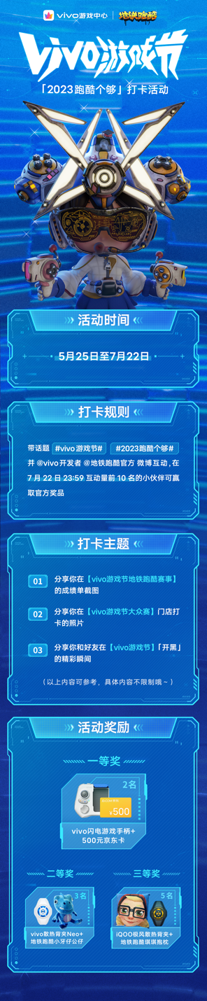 配合vivo大众赛报名启动,此次vivo游戏中心也将于5月25日同天开启“2023年跑酷个够”话题打卡活动,用户可通过晒游戏成绩、门店打卡、录制视频等方式参与打卡,7月22日活动截止当天微博互动量前十名的小伙伴们将有机会赢取vivo游戏手柄、散热背夹、游戏周边等惊喜奖品。除vivo大众赛外,vivo也将于6月正式启动游戏中心线上挑战赛报名,赛事主要以游戏地铁跑酷的无尽模式进行选拔,并在指定时间内决出玩家名次后进行奖励,选手们也可通过游戏内及vivo游戏中心的活动页实时浏览个人排名。
