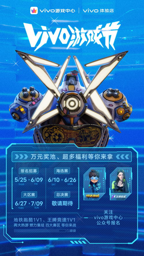 此次vivo大众赛将分别在以哈尔滨、武汉、上海、深圳为中心的东北、华中、华东、华南四个大区的vivo线下体验店举办赛事活动,年满18周岁的人群皆可参加此次活动招募。赛事的游戏设定为王牌竞速、地铁跑酷两款手游中的1V1模式,并采用单败淘汰制进行选拔。通过海选赛、大区赛的最终获胜者将会师7月中下旬总决赛,问鼎全国冠军。两款游戏均为各个赛段的获胜者准备了价值50元到800元不等的游戏周边、以及价值400元到2000元不等的现金奖励,激励各位参赛选手奋勇夺魁。
