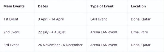 三次赛事的举办地点和日期分别为:4.3——4.14卡塔尔多哈,7.22——8.4秘鲁利马,11.26——12.6卡塔尔多哈