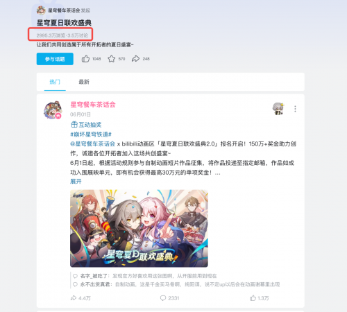 此外,玩家对二创的积极性与其于游戏的认同度,在一定程度上呈正比。比如《星铁》去年就开始举办的二创活动【星穹夏日联欢盛典】,在活动期间多个视频播放量过百万、话题总阅读量近三千万,足以说明玩家对于《星铁》的热爱。今年的【星穹夏日联欢盛典2.0】也已于六月份开启,在话题下已陆续有玩家积极投稿创作。