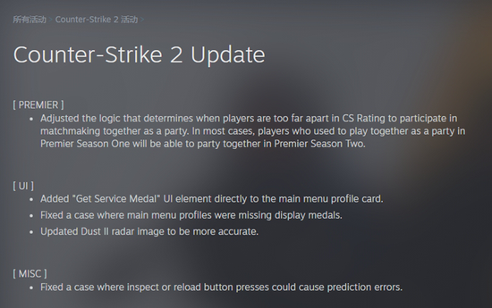 调整了判定玩家之间CS Rating差距过大而无法组队参与匹配的逻辑。在大多数情况下,曾在Premier模式S1赛季中组队游玩的玩家,在Premier模式S2赛季里将能够继续组队。