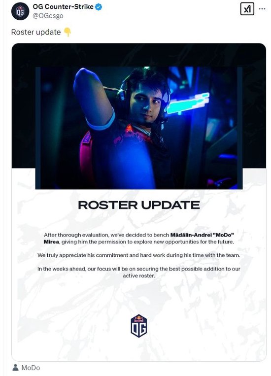 OG宣布将MoDo下放至替补席,结束了这位罗马尼亚选手在俱乐部的十个月效力期。OG在一份声明中表示,MoDo已被允许探索新的机会。