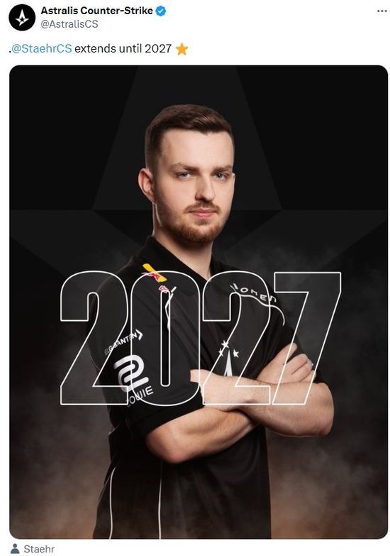 Astralis在社交媒体官宣与Staehr完成续约,这位丹麦选手将在队伍效力至2027年。