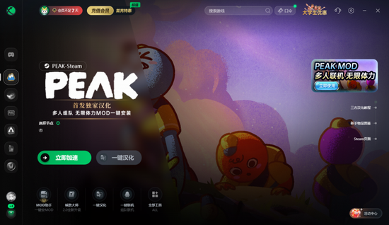 PEAK联机的话裸连会出现游戏卡顿,延迟高的问题,非常影响大家的游戏体验,用迅游加速器,一键优化网络,流畅联机无烦恼。还有MOD助手,一键下载存档MOD等超多MOD。