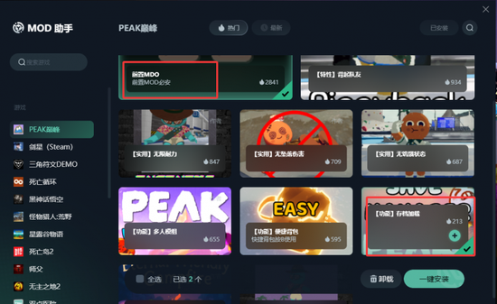 选择需要的MOD点击加号,就可以一键下载安装。记得先安装最前面的前置MOD,然后点击功能存档的MOD,点击一键安装就可以了。其他MOD也是一样的,一键安装就可以。