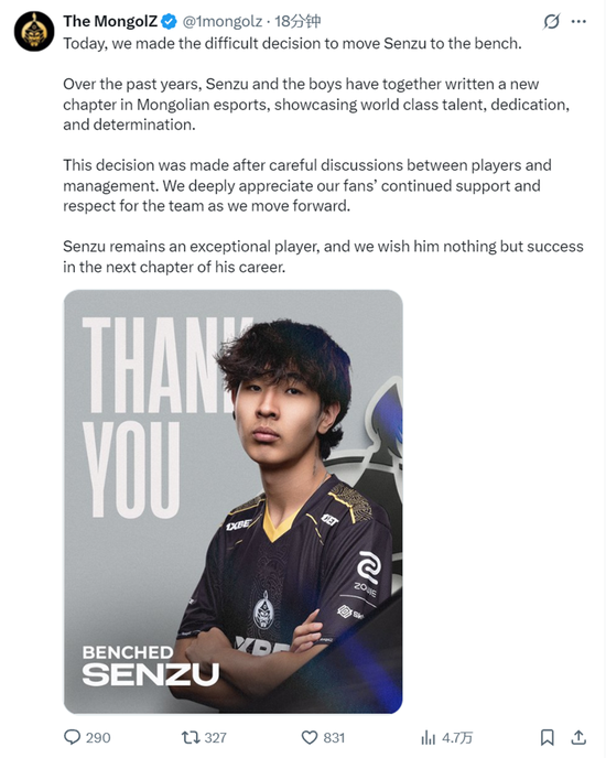 The MongolZ战队宣布了一项令人震惊的决定:将19岁步枪手Senzu移出主力阵容,其即日起正式进入替补席。