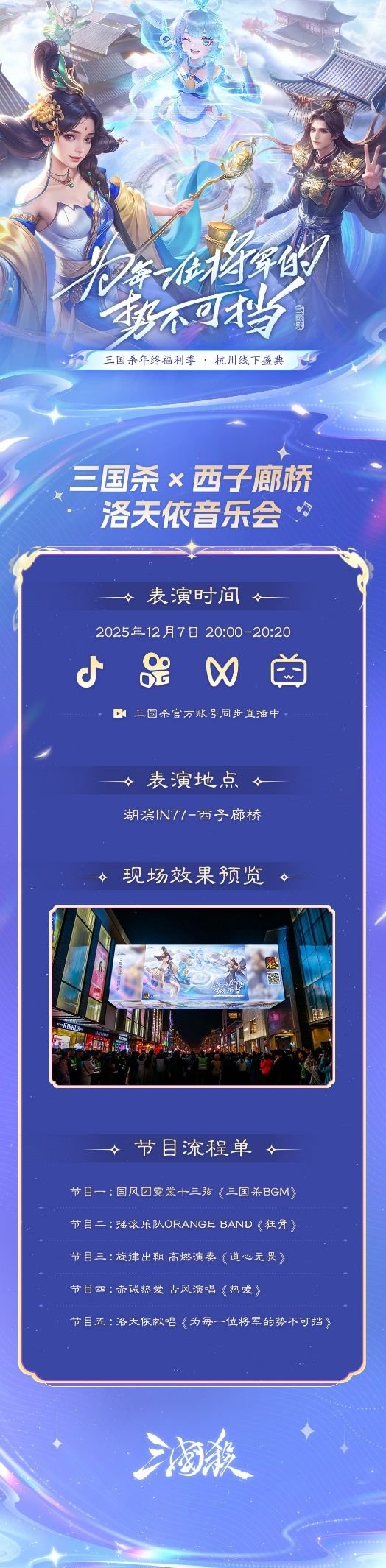 12月6日,西湖之畔将奏响三国乐章!洛天依领衔演唱,还有摇滚乐队ORANGE BAND助唱!清澈歌声搭配粼粼波光与远山黛影,让三国热血与江南诗意完美碰撞,沉浸式感受跨次元音乐盛宴,随手一拍都是湖景氛围感大片!