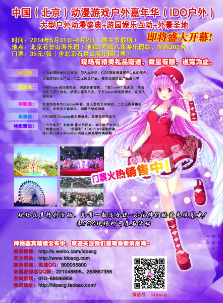 端午好时节,活动早知道。中国(北京)动漫游戏户外嘉年华(IDO户外)大型动漫游园会即将于2014年5月31日-6月2日在北京石景山游乐园开幕,诸多精彩活动信息出炉,欢迎广大爱好者来先睹为快哦~!