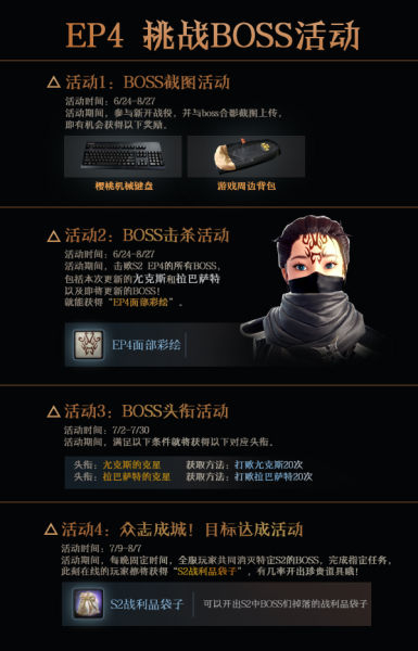备受玩家期待的《洛奇英雄传》EP4最新战役来袭,相信有不少人已经在摩拳擦掌,跃跃欲试了!EP4新战役纪念活动也将同步上线,带来惊喜好礼哦!6月24日(维护后)至8月27日(维护前),玩家以尤克斯或者是拉巴萨特为背景截图参与活动,就有机会可以获得樱桃机械键盘,游戏周边等实物好礼哦!同时,集齐4个EP4纹章碎片的话,会发放非常个性的 EP4 纹章哦!并且在此活动期间内,完成S2的玩家,还可以得到EP4 面部彩绘的奖励,赶紧行动起来吧!