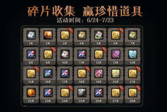 在《洛奇英雄传》EP4新版上线之际,小伙伴们还可以享受到一个月的签到活动哦!6月24日(维护后)至7月23日(维护前),玩家在游戏内签到,可按签到的天数获得各种游戏道具,每签到三天即可获得“签到碎片袋子”一个,碎片可用来兑换高级武器诱惑符咒、黄金迷你赤怒酋长、银雪狼等稀有道具哦。并且在此活动期间内,周末(周六、周日)的18:00——22:00点,还将进行每隔10分钟发放一次道具,有经验值,AP,碎片盒子等。