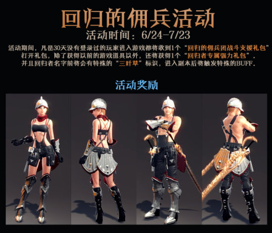 6月24日(维护后)至7月23日(维护前),活动期间登录游戏的玩家,如果在之前的30天内没有登录的话,就会享受回归者的福利。除了对回归者发放回归者佣兵礼包外,还将追加发放一个回归者礼包。回归者礼包,只可通过回归者钥匙来打开。