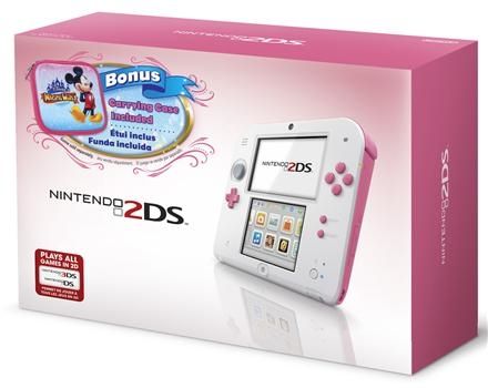 现在,任天堂再次推出了一款“桃粉”(Peach Pink)色新款2DS主机,可爱的粉/白配色加上别致的迪士尼收纳包,相信会让每一个看到它的小萝莉们疯狂。(或者还能顺便发掘出几只小正太的隐藏属性也说不定)