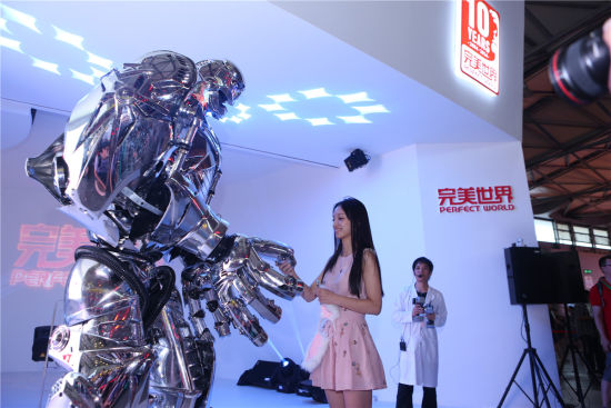 K1的小伙伴也很受欢迎哦完美世界展台的活动最为引人注目的自然是大机器人K1和他的小伙伴们的表演,而旁边高挑靓丽的大模更让这个舞台增添风采。大屏上视频活动也让为了进入完美世界展台排场唱长长队伍的玩家在进入展台前激动的心情里更添乐趣。