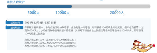 这次的灵纪元点赞活动除了能拿到尊贵无比的特权礼包外,参与人数达到一定数量时,将在19号新服发放对应数量的百元红包。点赞人数达到5000将发放1000个100元现金红包,点赞人数达到10000将发送2000个100元现金红包,点赞人数达到20000以上将发放3000个100元现金红包。只要你在规定时间内将自己的特权区角色升至一定等级,就能获得限量的百元红包。