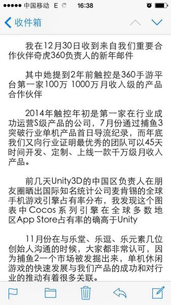 面对这样的数据,Unity 3D中国区总裁:符国新先生表示不服。在2014年度中国游戏产业年会的演讲上,符国新讲到:每一年将近4万多款的Unity游戏在开发,我们国内也有将近75%的市场份额,刚才昊芝也提到了他的数据,我简单微信群里面纠正了他,其实麦肯锡报告出来今年全球Unity除了国内的安卓市场之外,其实其他的市场还是以Unity的市场份额比较大。