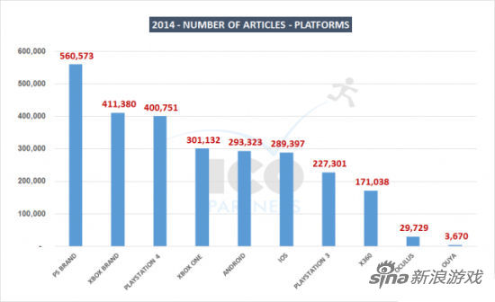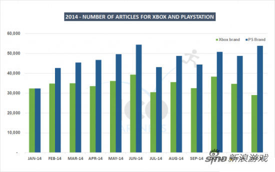 除了报道的文章篇数外,ICO还在媒体新闻标题上进行了对比。PlayStation再次超越Xbox成为2014年被提及最多的品牌,尤其是在12月份,主要原因在于索尼在这个月举办了PS体验会。