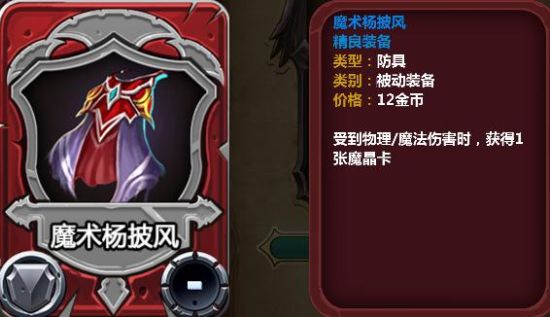 阿诺德之盾3、魔术杨披风:受到物理和魔法伤害时,获得一张魔晶卡。魔晶卡是随机获得,有了这件装备,受到伤害有时候却成了意外惊喜。如果摸到一张镇定剂怎么办?那么就要开心的笑起来了!