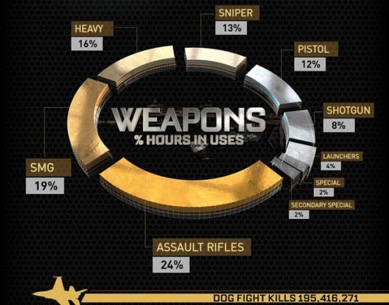 例如,如果你玩过该游戏的多人模式,你可能会猜到玩家的首选武器是突击步枪,其次是SMG,和狙击武器。自发售以来,玩家已使用了2249728574(超过22亿)颗手榴弹。其中44%是普通手榴弹,其次是塑胶手榴弹,占到35%。还有,全球玩家们使用喷气跳跃的距离也足够环绕地球一万四千圈。