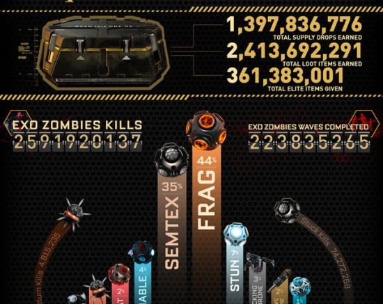 《使命召唤11:高级战争(Call of Duty: Advanced Warfare)》开发商Sledgehammer宣布,玩家们已经在“EXO外骨骼僵尸”模式中屠杀了2,591,920,137(超过25亿)个僵尸。Sledgehammer新公布了一份新信息图表,此表收集了该游戏自发布日(2014.11.3)起至今的很多方面的信息,其中有很多有趣的数据。