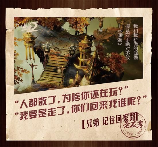 《武魂2》老友季主题海报这名从内测坚持玩到现在的老玩家在网络上表示,制作MV原本只是想给自己的游戏生涯一个交代,没有想过怎样,但是看到很多认识的不认识的朋友都在贴吧留言,其实还是非常开心。因为真实的亲身经历,熟悉的歌曲记忆,让热爱游戏的人更热爱生活。由此可见,以往大家对动作类PK类网游的玩家的刻板印象也不全是对的,他们并不是只会打打杀杀,那些在战斗中碰撞出来的情谊也许更弥足珍贵。《武魂2》作为网易旗下首款全息真实动作网游,在拥有多样性丰富MMO玩法以及激烈火爆的PK氛围的同时,为兄弟情舍生取义,会为对手惺惺相惜,会为感情真心付出的情谊同样也是最鲜活的存在。