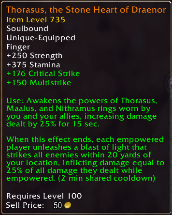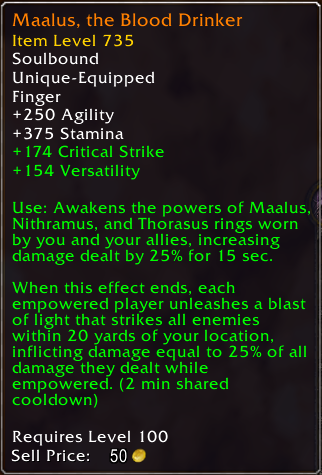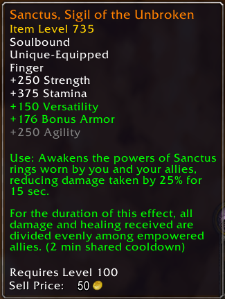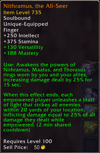 DPS:唤醒你和你的同伴所佩戴的Maalus,Nithramas和Thorasus戒指的能量,造成的伤害提高25%,持续15秒。效果结束时,每个被强化的玩家施放一道圣光冲击,攻击你所在位置20码内的所有敌人,造成相当于被强化时造成的所有伤害的25%的伤害(2分钟共享冷却)。