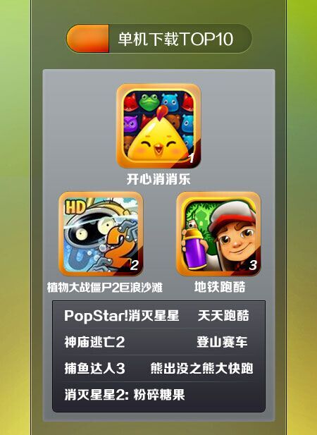 单机游戏依然没有过多亮点,《开心消消乐》《植物大战僵尸2巨浪沙滩》《地铁跑酷》占据三甲行列。网游重度化趋势已经非常明显,并且在收入规模上网游也更具优势,使得从一定程度上影响了单机游戏的发展,正在面临青黄不接的局面。为了扶持单机游戏发展,九游平台将会在近期开放单机大事件提交通道,开发者可以通过开放平台提交相关需求,九游将会根据需求进行给量及相关资源匹配。
