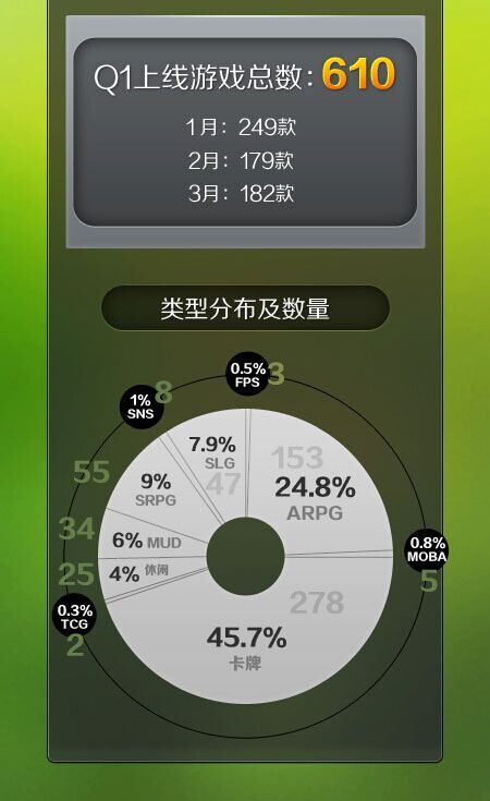 第一季度,九游平台上线网游数量达到了610款,每月平均数量已经接近超过200款,可见当前手游市场的竞争仍在不断加剧。在游戏类型分布上,卡牌游戏仍然占据超过4成份额,但已难见爆款。ARPG的增长比较稳定,是当前市场比较受欢迎的类型。今年年初开始,一个新的游戏类型,MUD挂机类游戏开始崭露头角,作品开始逐渐增多。虽然目前已经获得了一定的市场认可,但还属于偏小众类游戏,后续前景有待观察。FPS、MOBA虽然目前市场上产品很少,但是效果却非常好,《全民枪战》《乱斗西游》《自由之战》都取得了非常优秀的成绩,可谓是一鸣惊人。这也说明,随着手游市场的发展和用户不断成熟,开始有更多的人开始寻求新奇、刺激的游戏,抛弃传统游戏类型。这将会让手游细分市场带来更多机会。