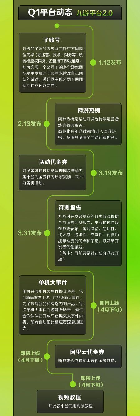 3.16日北京国家会议中心,九游正式公布了2015年的新战略——平台2.0。九游将开放更多平台能力,让游戏开发者在与平台的互动中由被动变为主动,核心就是将评测数据、营销预热、用户服务等运营资源及平台服务模块化,让游戏开发者自主申请、自由支配。开发者可以自己决定产品的运营节奏,并利用九游提供的各种运营资源或服务模块自主实现。目前九游正在不断开发服务功能模块,陆续开放给开发者。