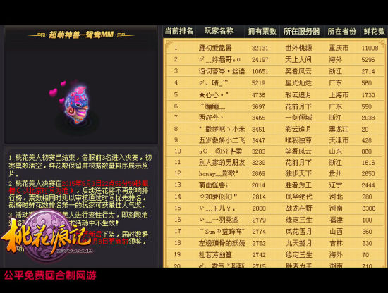 桃花美人决赛排行榜传奇之神“龙爵”的夫人,不仅拔得头筹,成功获得“第一美人”的头衔,还同时以最多的鲜花数获得最佳人气奖。果真雁初女神集万千宠爱于一身!
