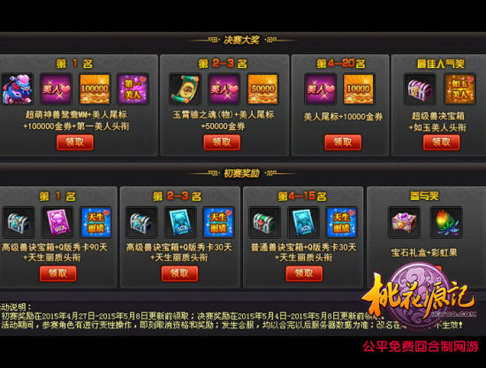 初赛奖励在2015年4月27日开始领取,决赛奖励在2015年5月4日开始领取,活动NPC将在2015年5月8日更新后小时,届时所有活动数据清空,奖励无法再领取!