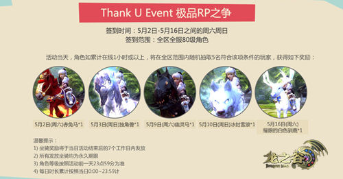 世界这么大,我想去看看!想要尽情探索阿尔特里亚大陆,一定少不了拉风的坐骑。欢乐五月《龙之谷》掀起极品RP之争!绝版坐骑缤纷现世,只有RP之王才有机会将其收入囊中。5月2日至5月16日之间的周六周日,只要累计在线时间超过一小时,即有机会参与抽奖活动,赢取绝版永久坐骑。赤兔马、独角兽、幽灵马、冰封雪狼、耀眼的白色驯鹿五大绝版坐骑免费送!这一次的终极RP挑战,你有信心吗?!