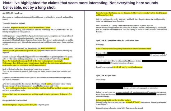 消息来源从Konami最近的新闻看来,这份消息中所描述的内容很有可能就是小岛工作室内部的现况,但就像上面提过的那样,希望大家还是能将这篇新闻当做一则传言看待,详细的消息来源请参阅
