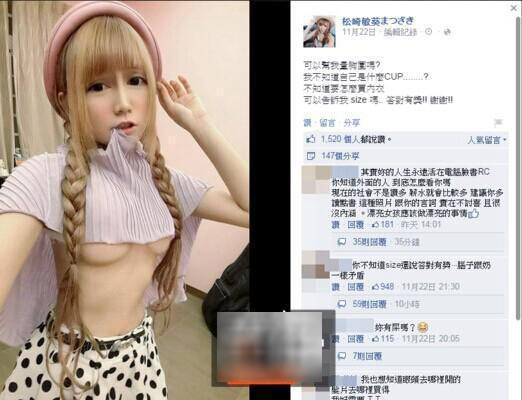2015年2月,台日混血模特兼网络主播“松崎敏葵”自爆一张用嘴咬住衣服、露出下半球的火辣照,声称不知道自己胸围尺寸,要求网友替她“量胸围”,豪放举动引起热烈讨论。