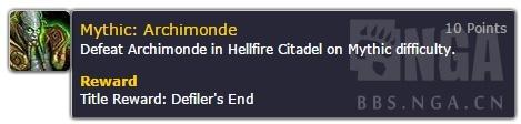 史诗:阿克蒙德 在史诗难度地狱火堡垒中击败阿克蒙德。 10点。奖励头衔:污染者的终结者。10点。