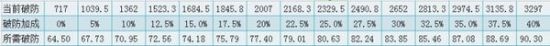 以64.5提升1%技能伤害,860防御为93级BOSS目标防御,在没有减防御BUFF的情况下,易经阵里的冰心单袖气时面板破防,在团队输出时不同面板破防值时提升整体1%输出所需的破防值如下: