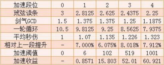 玉素流,加速一共分4段:一段6点,二段102点,三段519点,四段1001点。影响的是玳弦急曲读条的时间以及技能GCD,收益计算大致如下: