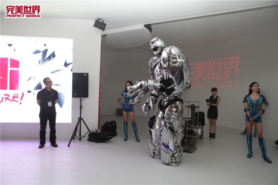 完美世界还为玩家们带来了一个巨型机器人,一天三次为玩家提供歌舞表演,伴着音乐声起,巨型机器人和他的四个小兄弟憨态可掬的舞蹈让玩家纷纷举起相机和手机拍影留念。而一旁的互动换装区和互动合影区里,玩家们纷纷装扮成自己心爱的游戏人物或者进入自己喜欢的游戏场景,通过现代科技,体验一把去古代的神游或者魔幻的向往。