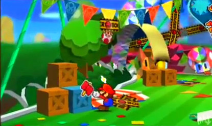 对话完后,控制马里奥撕下图中的贴纸,拯救这个被贴住的小蘑菇,然后它会给你游戏中的必备道具——锤子。按B键即可无限次使用,游戏中玩家需要用锤子砸各种地方、小怪物等(小蘑菇也能砸,会砸扁,略喜感),居家旅行常备佳品。