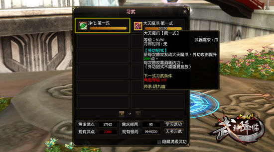 等级提升带来新技能对于外功招式大家都很熟悉,在进入游戏伊始,玩家便自带的一个增加外功伤害的主动BUFF技能,新的BUFF技能则在100级时可以学习。在武点充裕的情况下,初始技能在100级时可学习至第十式,增加伤害1891,而新技能学习后便已达到了该数值,在学习完第一式后,数值则会达到2004。但是由于从80级开始,初始技能还需要从第七式开始学习,其所消耗的武点远远高于新技能。所以在性价比上,新的外功BUFF占有全面的优势。