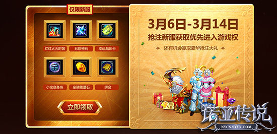 3月6日10:00—3月14日16:00期间,登录新服“王者崛起”或者“情义”创建角色,并于3月14日当天进驻到新服体验游戏,就有机会赢好礼,开服当天,所有抢先创建的角色,还享有优先排队进入游戏的特权哦!