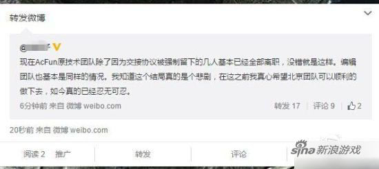 有Acfun的前员工爆料称:“现在Acfun原技术团队除了因为交接协议被强制留下的几人,基本已经全部离职,没错就是这样。编辑团队也基本是同样的情况。我知道这个结局真的是个悲剧,在这之前我真心希望北京团队可以顺利的做下去,如今真的已经忍无可忍。”