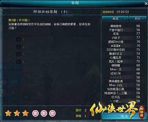 游戏截图别以为《仙侠世界》是仙侠类的网游,答题内容就一定要全部皆是上古神话的问题。像是历史类型“1897年冬,派军舰强佔胶州湾的帝国主义国家是?”、脑经急转弯类型“花的老公叫什么?”、数学类问题“99*99*99=?”样样皆有。每到这种时候就需要各路学霸纷纷出动了,将问题荟萃整理,在论坛上服务大众啦!
