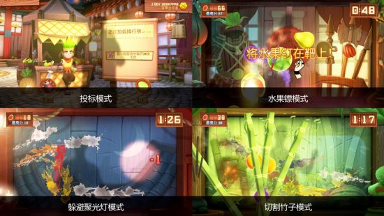 3,躲避聚光灯模式:由“麻丽”主持的忍遁训练,在切削水果的同时要移动人物投影,躲避占据背景大部空间的聚光灯。