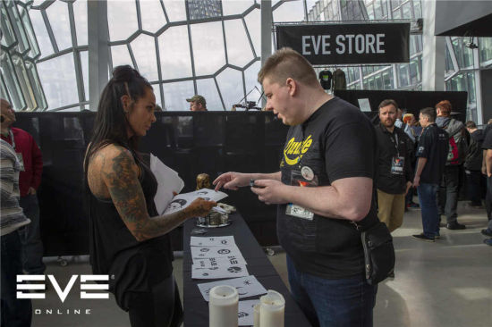 生动的演讲外场展品区内,百余件EVE绝版周边首次与玩家见面,尽管展品价值不菲,但陈列方式却极其低调,与国内游戏嘉年华声势浩大的宣传活动而言大不相同。显然,CCP并不希望玩家们的观摩受到任何干扰。另一侧的拍卖区也是一样,玩家正安静地在拍卖纸上写下价格,没有拍卖师,但拍卖同样井然有序。而在大厅的一角,还有纹身、理发等特色服务,可以免费为玩家打造游戏中人物的发型以及提供各种势力Logo纹身,不少勇敢的玩家正跃跃欲试。