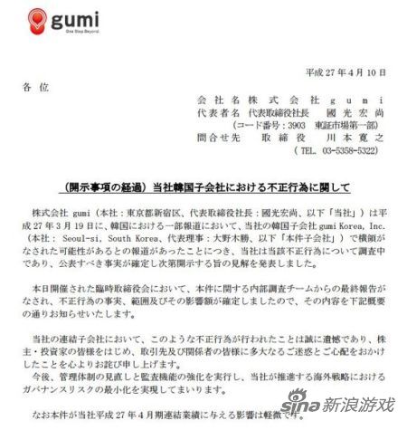 就在4月10日,gumi于官网发布公告,证实了韩国子公司员工利用商务卡、虚假交易等方法营私一事,该员工累计侵吞公款3800万日元(合计196万人民币),目前gumi已经对该名涉案员工提起诉讼。