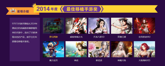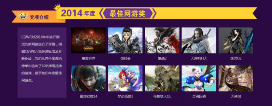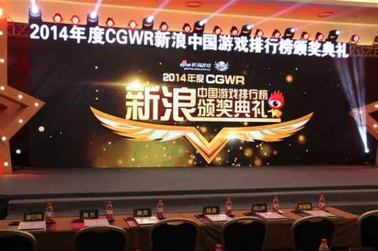 2015年4月22日,由新浪游戏主办的2014年度CGWR新浪中国游戏排行榜颁奖典礼于今日在国家会议中心成功举行。本届CGWR新浪中国游戏排行榜包含手游排行榜(97973排行榜)及网络游戏排行榜,共颁出60个端游奖项与60个手游奖项,涵盖了市面上最重磅、玩家口碑最佳、品质最优、且受到市场认可的游戏作品。各大获奖游戏厂商,游戏行业媒体均受邀出席此次盛典。