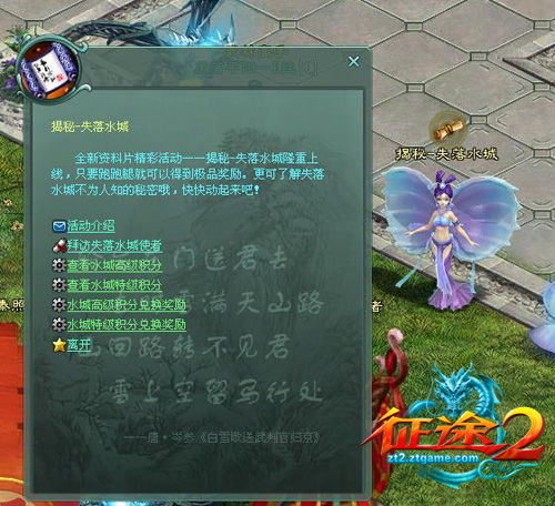 水城是《征途2》全新资料片中的一张新中立地图,在该地图中,玩家除了可以完成日常的任务活动,还可以体验惊险的水城寻宝,刺探拉镖等,更有甚者,水城还会经常上演一幕幕惊险的万人PK场景。