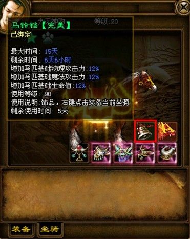 马铃铛可以在王城的坐骑装备大师处合成更高级的马铃铛,只有相同品质不同种类的马铃铛才能互动合成,合成之后的马铃铛将会继承原有马铃铛的所有属性(混炼的宝石属性不能继承)。而黄色品质以上的马铃铛可以在坐骑装备大师处镶嵌红玉石和绿松石。红玉石能提高马匹等级,绿松石能提高马匹资质。马铃铛的时效为15天,装备后开始倒数计时。