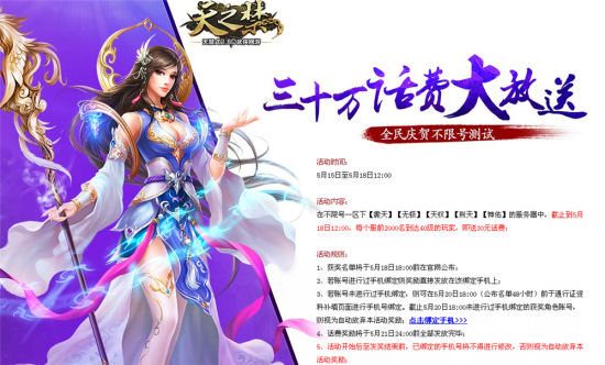 战无止禁全民庆贺不限号测试,三十万元话费大放送。如果你是传说中的练级达人,那么,这个活动完全就是为你量身定做的。在不限号一区下的服务器中,截止到5月18日12:00,每个服前2000名到达40级的玩家,即可得30元话费。让玩家在游戏之余还能赚钱,如此诱人的奖励,岂能错过。
